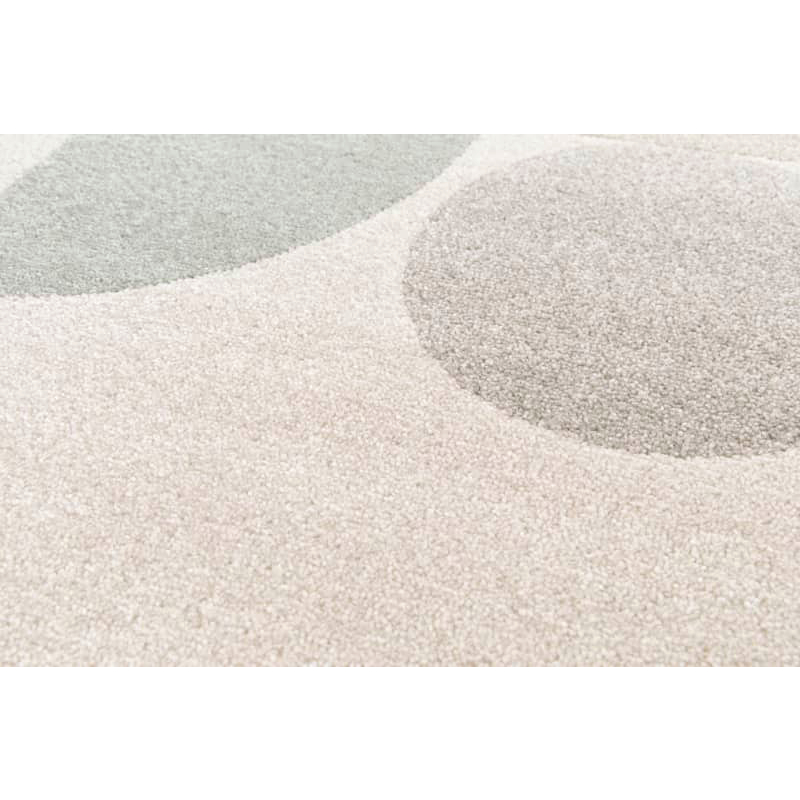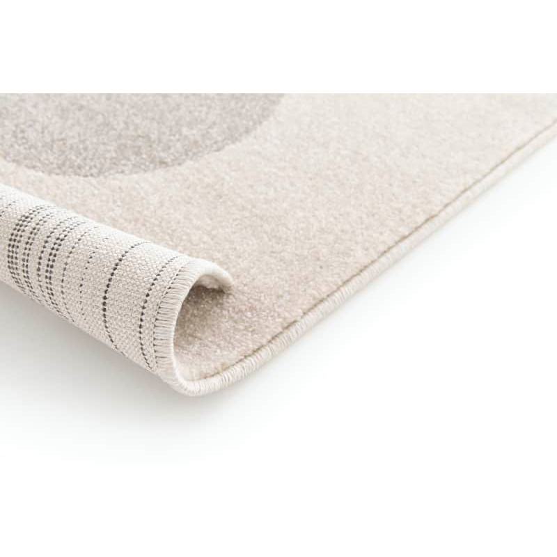 Пътеката впечатлява с модерен геометричен дизайн, съчетаващ абстрактни форми от кръгове и полукръгове. Меките кремави нюанси са балансирани с по-тъмни сиви акценти, което създава стилен и съвременен контраст. Този модел е идеален избор за интериори, в които се търси хармония между модерна визия и уют.