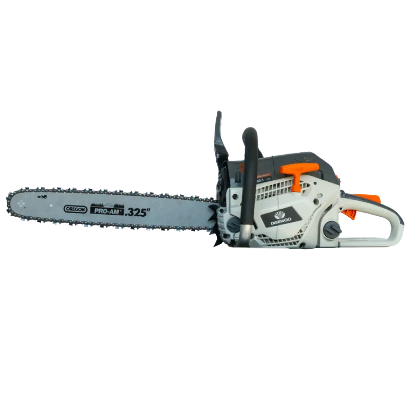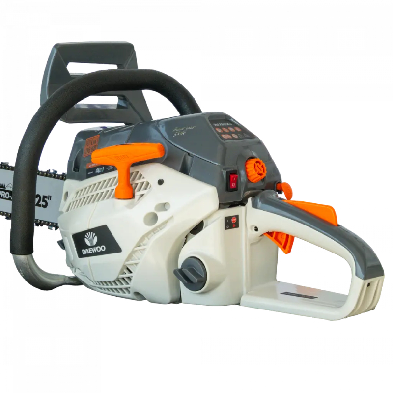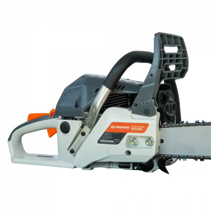 Трион верижен моторен DACS5218PRO 2.1 kW/(2.86 к.с) 45 см/18" на марката DAEWOO. Моделът DAEWOO DACS5218PRO е бензинова резачка от професионалната серия PRO LEVEL, предназначена за рязане на дървесина в строителството, дърводобива и поддръжката на двора. Със своя мощен 2-тактов двигател с обем 52 куб.см и шина с дължина 18 инча, резачката осигурява висока производителност при рязане на дърва за огрев, клони, трупи и други дървесни материали.