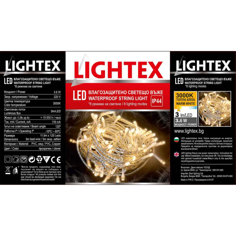LED светещото въже е с дължина 11.9 метра и 120 LED светлини. Въжето е оборудвано с 8 режима на светене, които ви позволяват да създадете разнообразни и интересни светлинни ефекти.