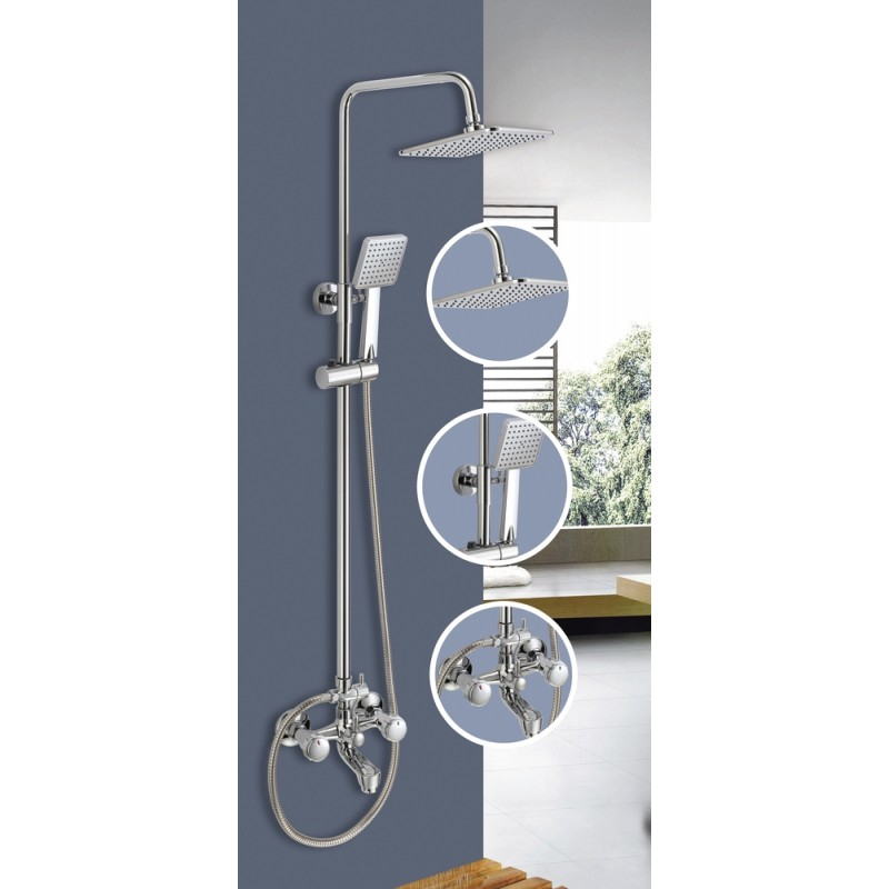 Телескопично тръбно душ окачване, оборудвано с висококачествен месингов смесител и пълен комплект аксесоари за комфортно ежедневно ползване. Системата включва стационарен горен душ, подвижен ръчен душ, превключвател, шлаух и чучур, което я прави практично и завършено решение за банята.