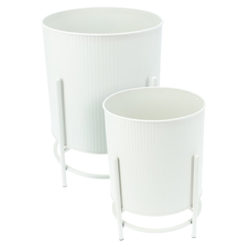 Комплектът включва кашпа с диаметър 20 см и височина 28 см и кашпа с диаметър 17 см и височина 23.5 см, всяка със собствена стабилна стойка. Металната конструкция осигурява сигурност и стабилност, а минималистичният бял цвят се комбинира лесно с различни стилове на обзавеждане.