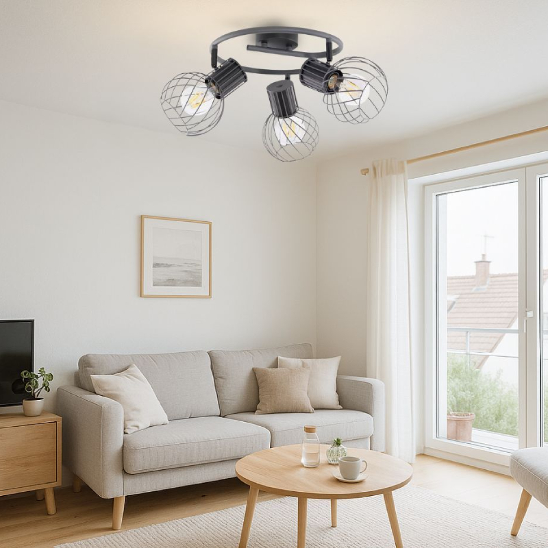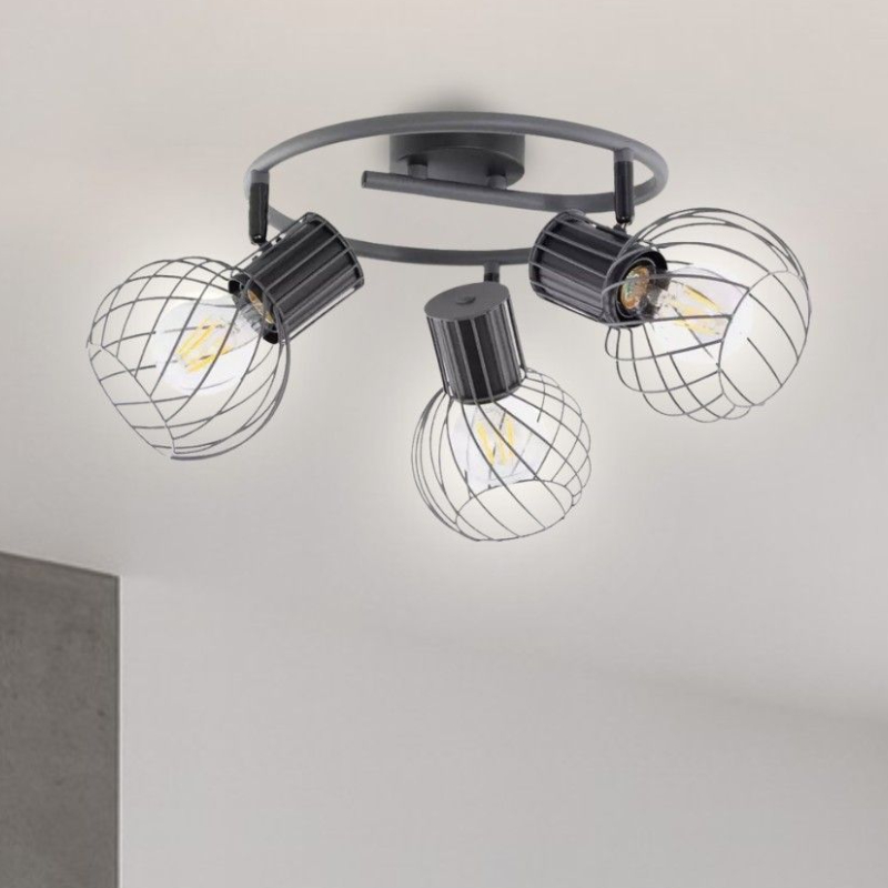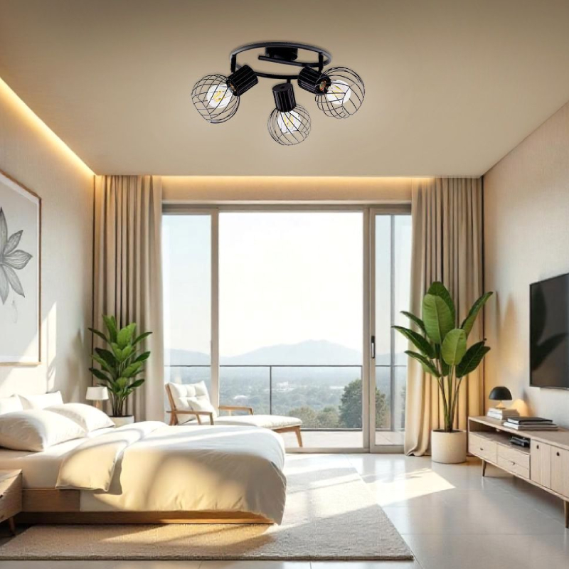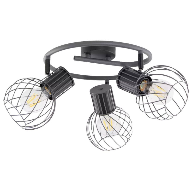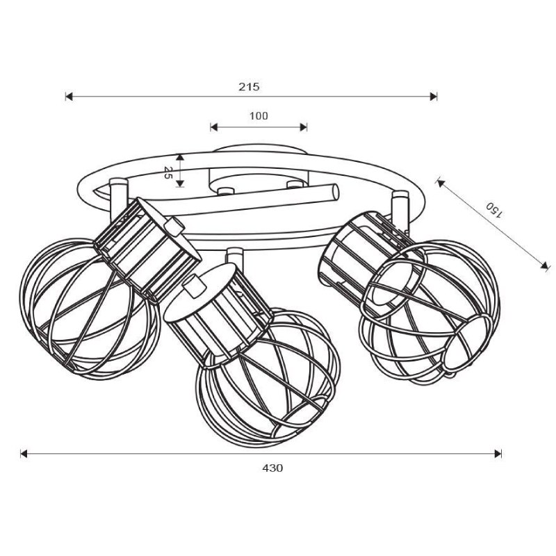 Моделът разполага с три подвижни спота, монтирани върху кръгла основа, което позволява прецизно насочване на светлината в различни посоки. Работи с три светлинни източника с цокъл E14 и е предназначен за външен таванен монтаж. Осветителното тяло е подходящо за вътрешна употреба (IP20), осигурява надеждна експлоатация и отговаря на европейските стандарти за безопасност. Особено ефектно изглежда в комбинация с декоративни филамент крушки с видими жички.