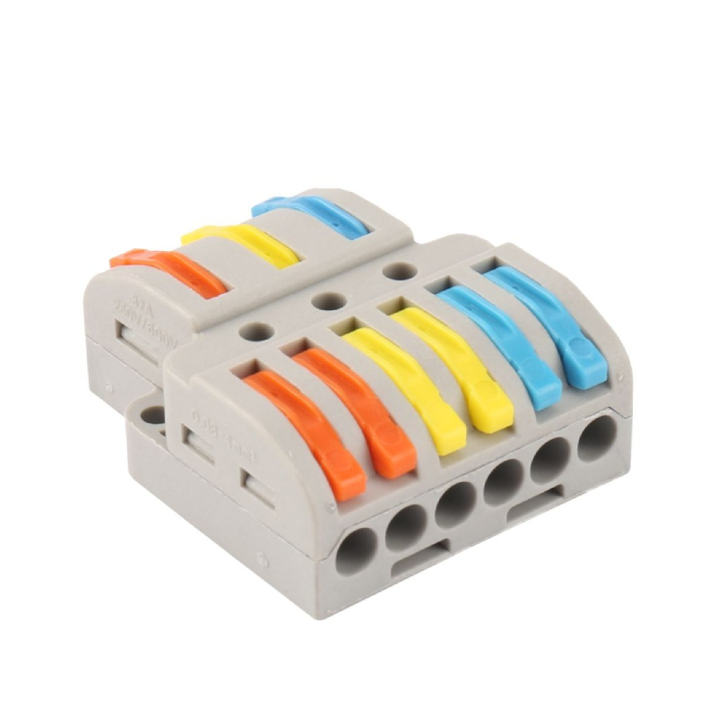 Моделът използва лостов механизъм за бърз монтаж без инструменти. Проводниците се поставят след оголване от 11 мм и се фиксират чрез затваряне на лоста, което гарантира стабилен електрически контакт. Подходящ е за твърди и гъвкави кабели и издържа натоварване до 32A при 250V, което го прави надеждно решение за домашни и професионални електроинсталации.