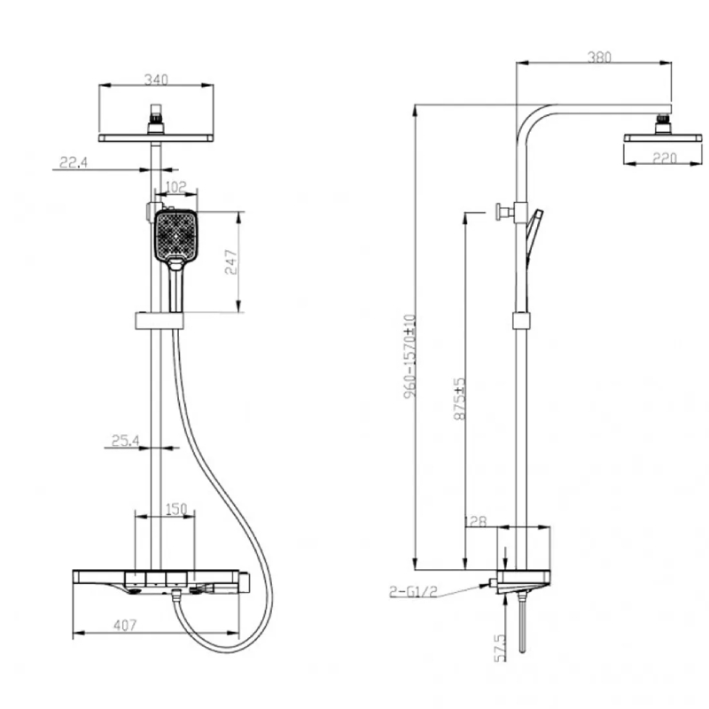 Системата разполага с регулируема височина в диапазон от 96 до 157 см, което позволява лесно адаптиране спрямо пространството в банята и индивидуалните предпочитания на потребителя. Тръбите са изработени от неръждаема стомана, която осигурява висока устойчивост на корозия, стабилност и дълготрайна употреба.
