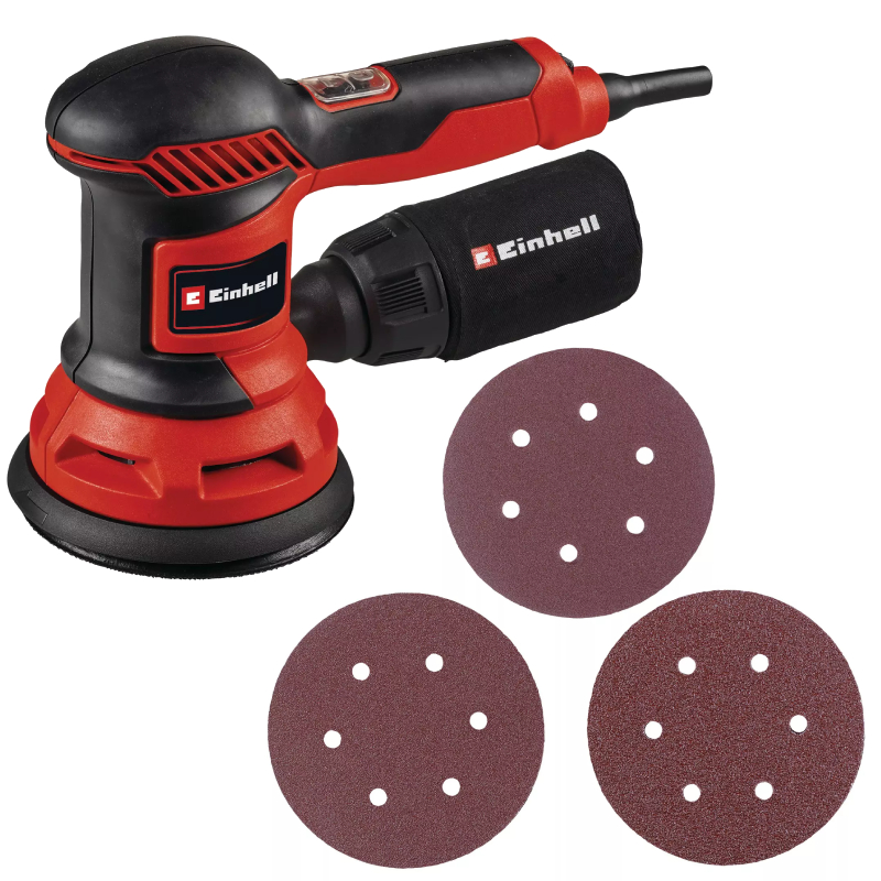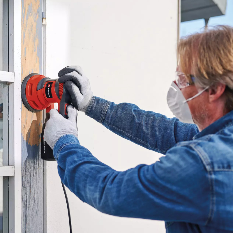 Einhell TC-RS 425 E е мощен ексцентършлайф (фреза за обработване на профилни повърхнини), предназначен за ефективно шлайфане на равни и извити повърхности от дърво, материали на дървесна основа, метал, пластмаса, боя и лак. Благодарение на ексцентричния принцип на работа и резонансна верига от 2.5 мм, инструментът осигурява висока степен на отнемане на материал и фино, равномерно шлайфане.