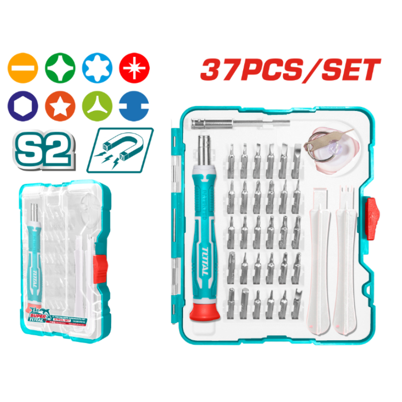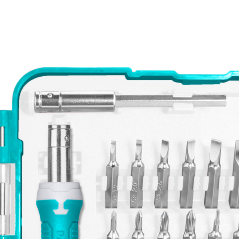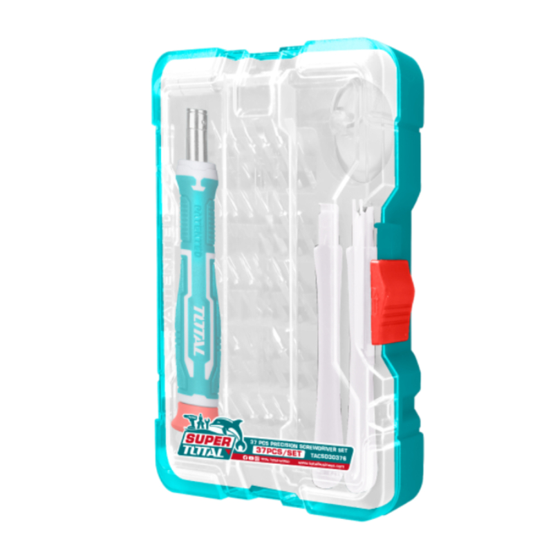 Комплектът TOTAL Industrial, 37 части предлага всичко необходимо за работа с електроника, мобилни устройства и малки механизми. Висококачествените битове от S2 стомана гарантират прецизност, дълъг живот и надеждност при многократна употреба. Ергономичната дръжка осигурява комфорт и точен контрол, а специализираните пластмасови лостове, триъгълникът, вендузата и шифтът улесняват безопасното отваряне на корпуси без риск от надраскване или повреда.