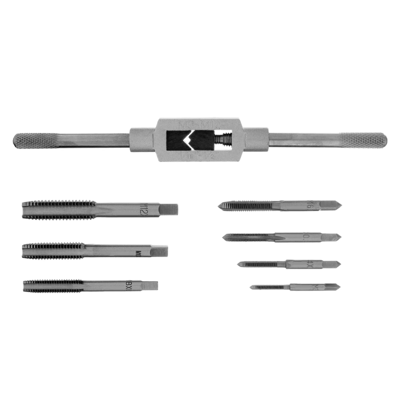 Метчиците са изработени от легирана инструментална стомана 9ХС, която осигурява висока здравина и устойчивост на износване. Работните части са закалени до 62-64 HRC, което гарантира дълъг експлоатационен живот и надеждно рязане на резби. Комплектът е подходящ за обработка на цветни метали и намира широко приложение при ремонт на автомобили, оборудване и различни домашни проекти.