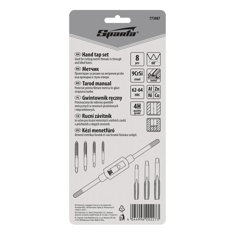 Комплектът метчици SPARTA M3-M12 (8 части) е предназначен за ръчно нарязване на вътрешни резби в различни метални детайли. Подходящ е за работа както с проходни, така и със слепи отвори, което го прави практично решение при ремонтни, монтажни и сервизни дейности. Комплектът включва няколко размера метчици и удобен държач, който позволява стабилно фиксиране и прецизен контрол по време на работа.