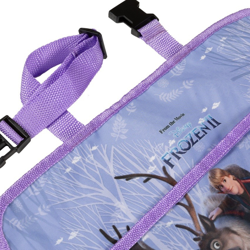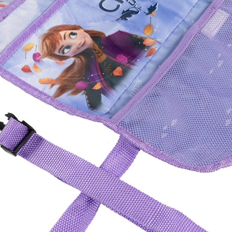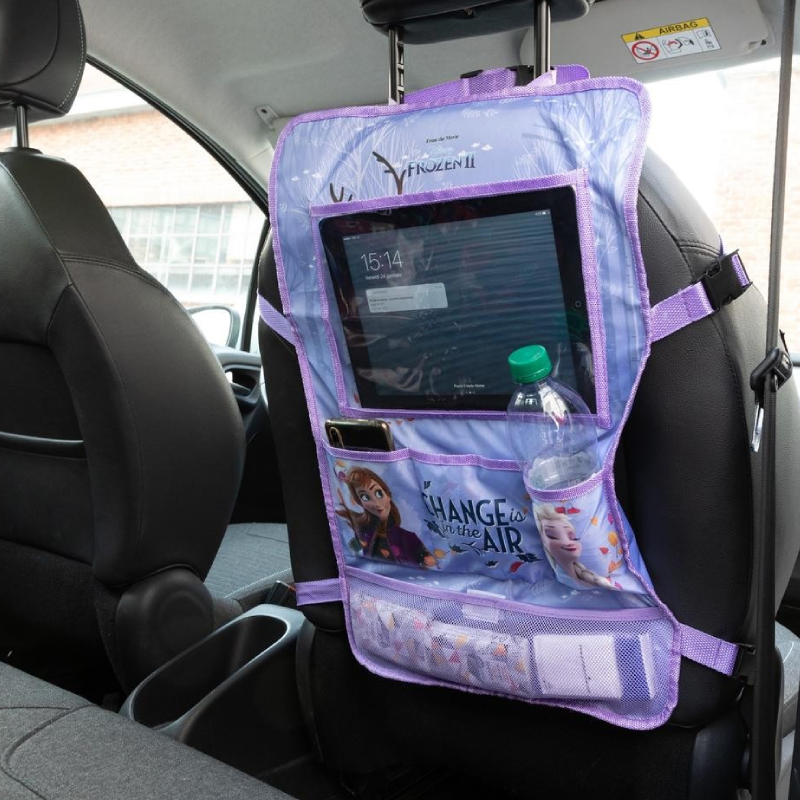 Органайзерът FROZEN AUTO PRACTIC е забавен и практичен аксесоар за кола, декориран с героите от популярния филм на Дисни "Замръзналото кралство" (Frozen). Той се монтира лесно на гърба на предната седалка чрез регулируеми колани, осигурявайки удобство и забавление за децата по време на път. Прозрачният джоб за таблет позволява гледане на филми, а множество джобове с различни размери предлагат място за съхранение на бутилки, играчки, книги и други дребни вещи.