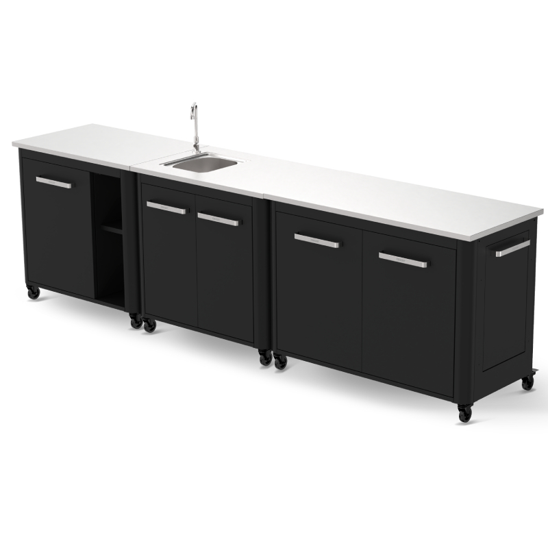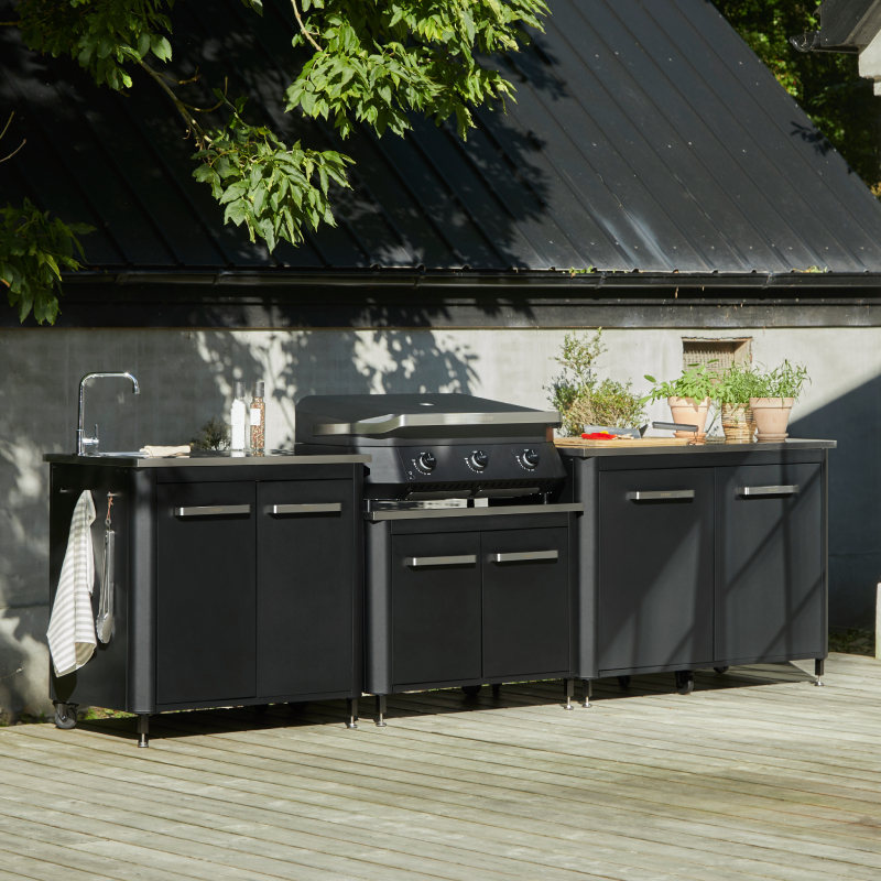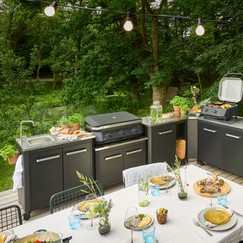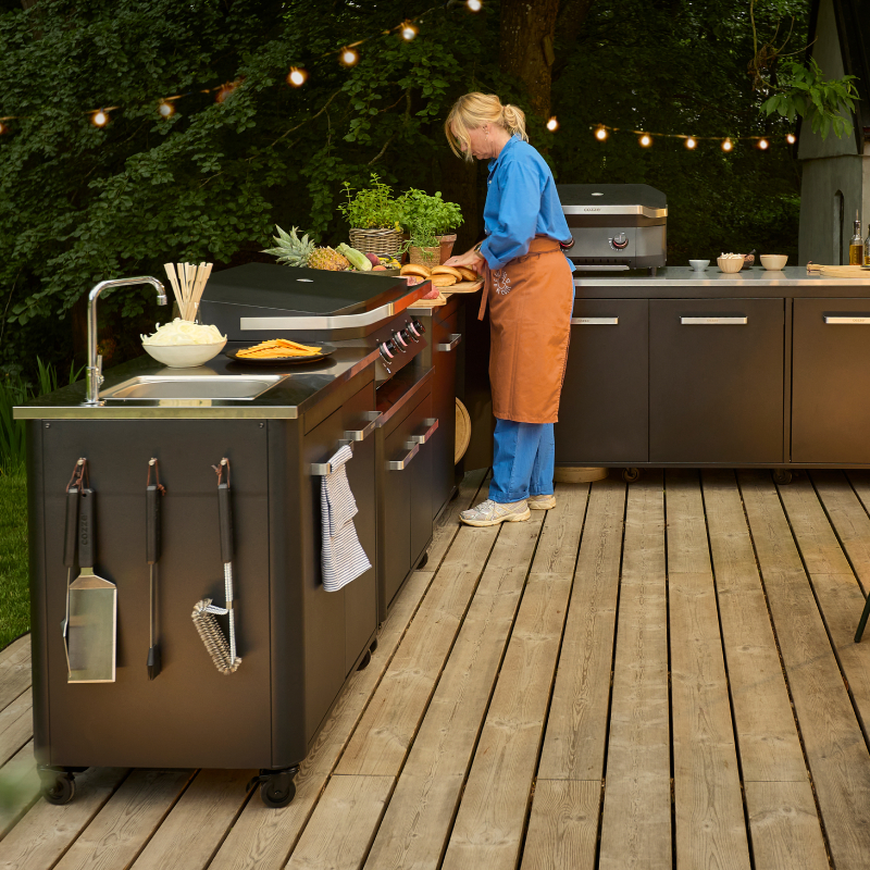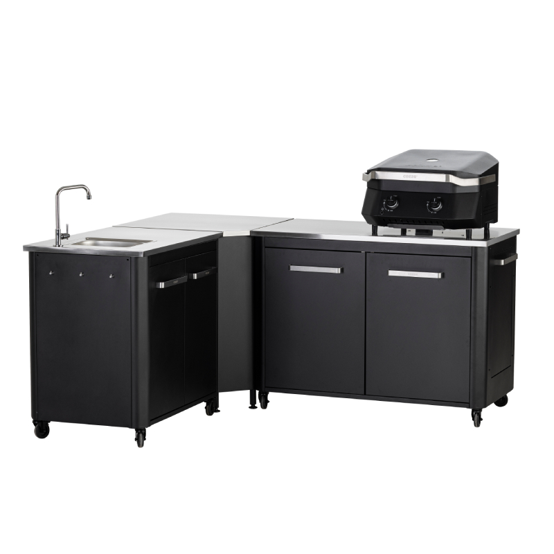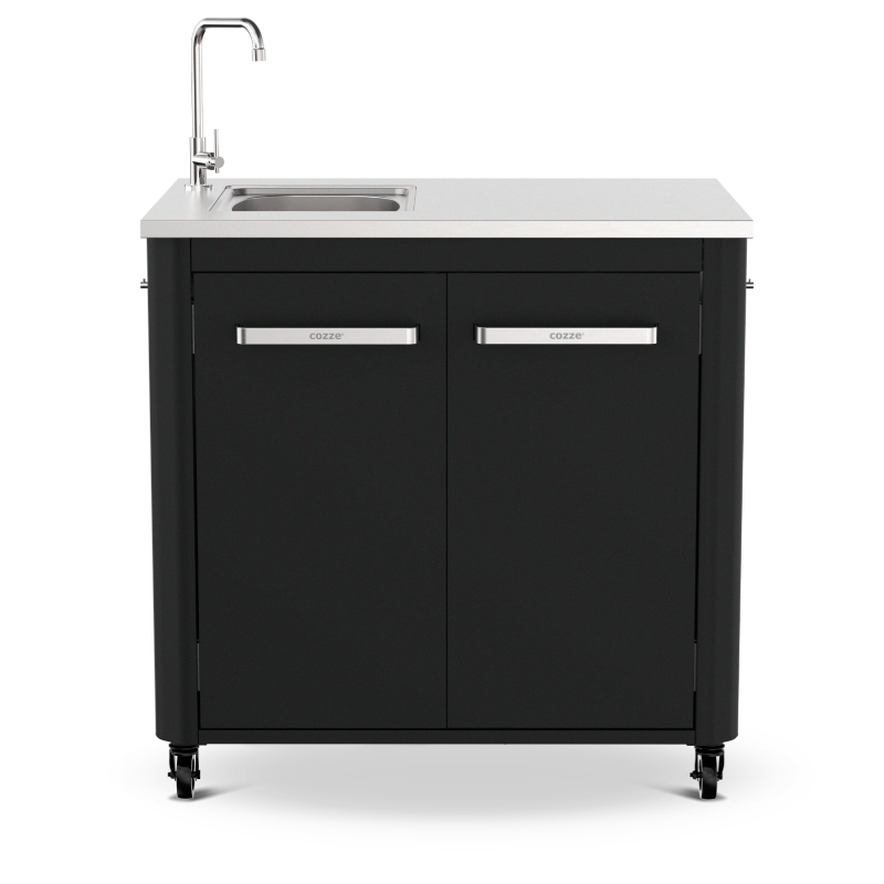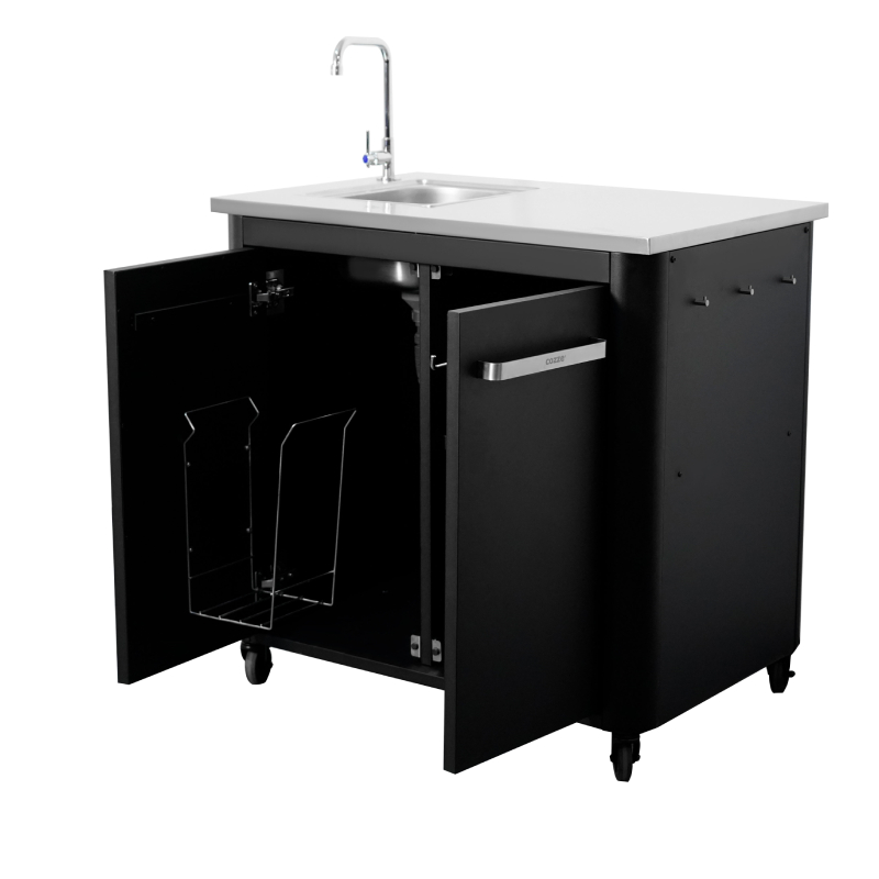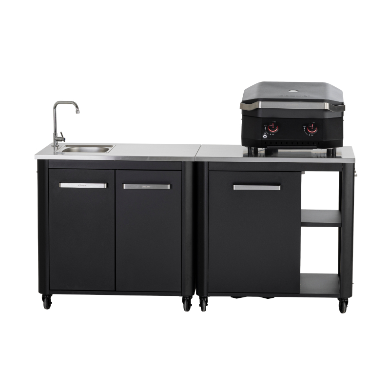 Модулът за външна кухня Cozze 90 с вградена мивка и смесител е практично и функционално решение за организиране на работното пространство на открито. Той комбинира стабилен неръждаем плот, водна зона и удобно място за съхранение, което го прави идеален за приготвяне на храна в двора, на терасата или до барбекю зоната.