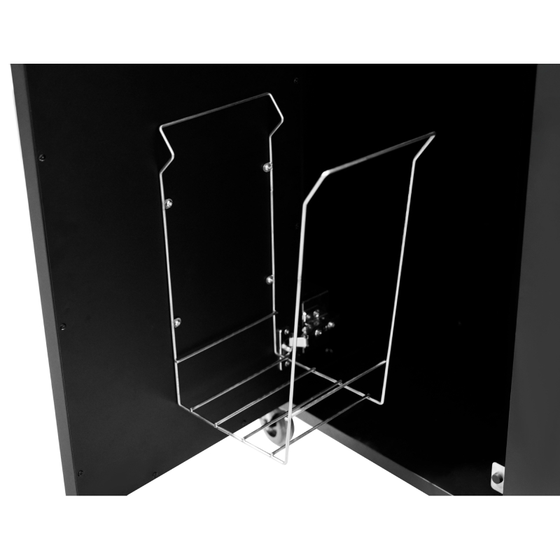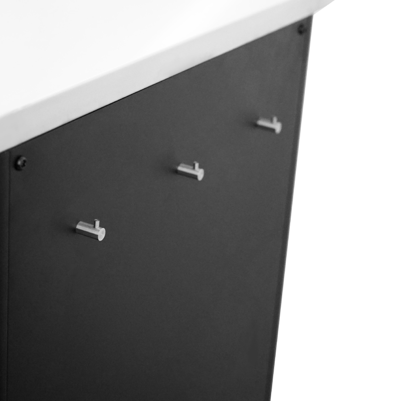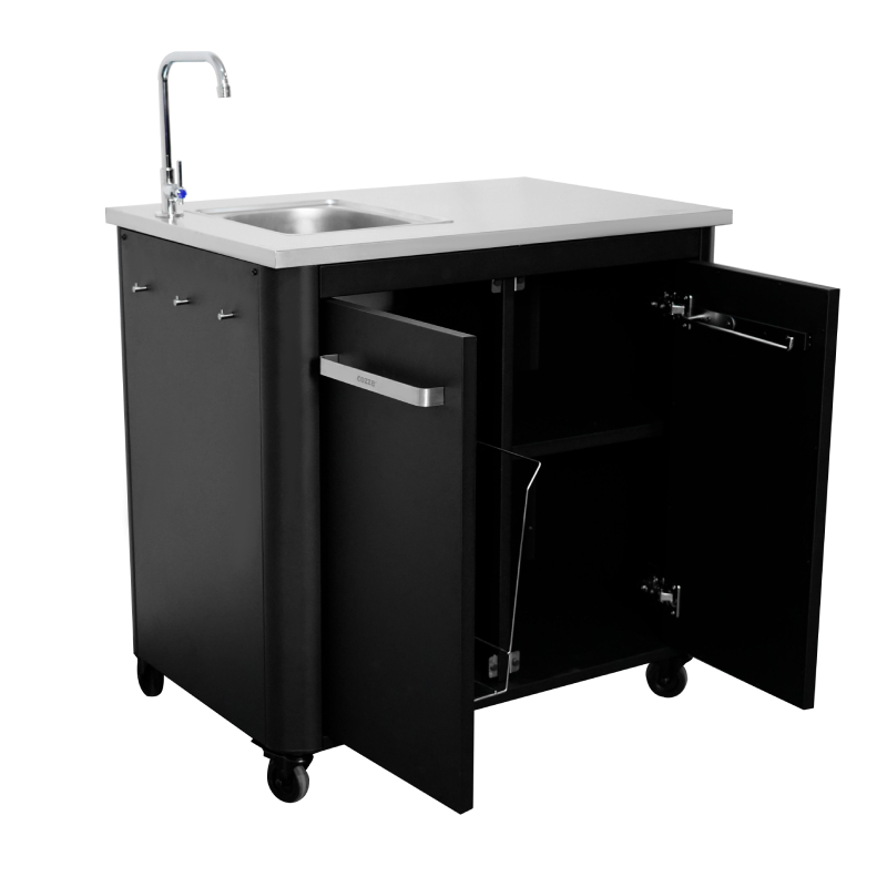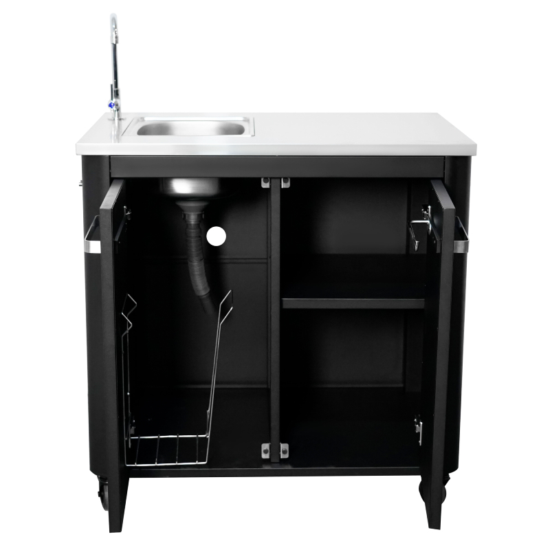Конструкцията от поцинкована стомана с прахово покритие осигурява устойчивост на атмосферни условия и дълъг експлоатационен живот. Вградената мивка със смесител (1/2" връзка) позволява директен достъп до вода, а двете врати с вътрешни рафтове и стойката за отпадъчна кофа гарантират отлична организация и удобство по време на работа.