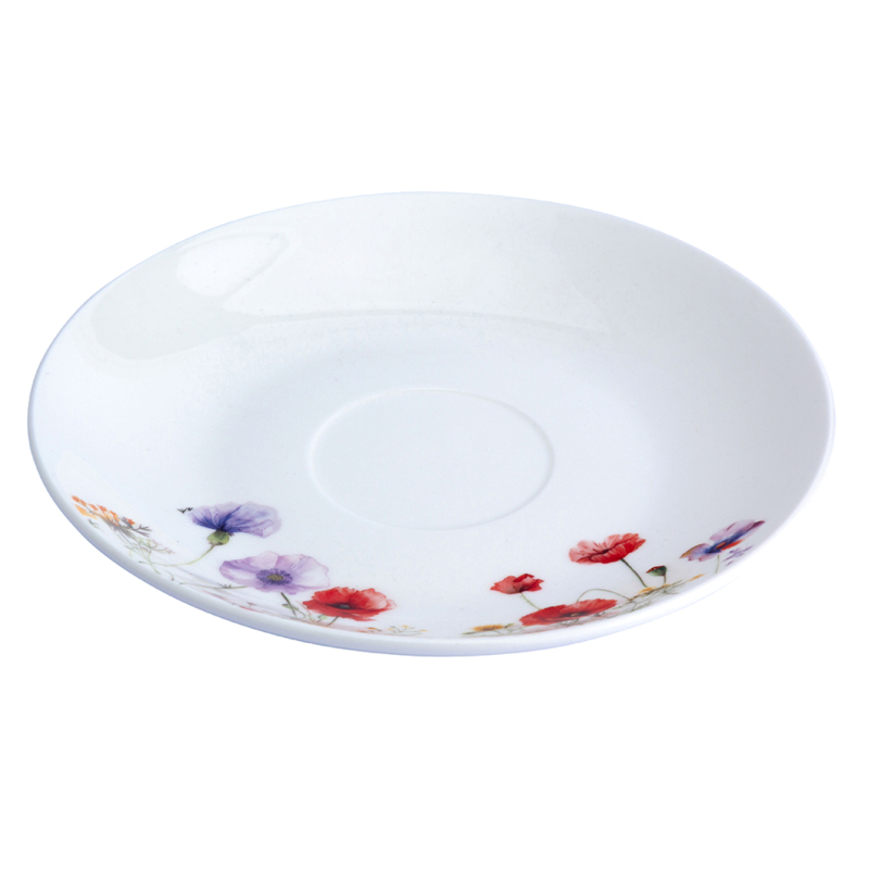 Флоралният мотив включва макове, метличина и жълти полски цветя, разположени в долната част на съда, създавайки ефект на плавно "израстване" нагоре. Този артистичен дизайн превръща всяко сервиране в естетическо изживяване. Благодарение на по-компактния си обем, комплектът е идеален за кафе, чай или еспресо напитки, като съчетава удобство и елегантност.