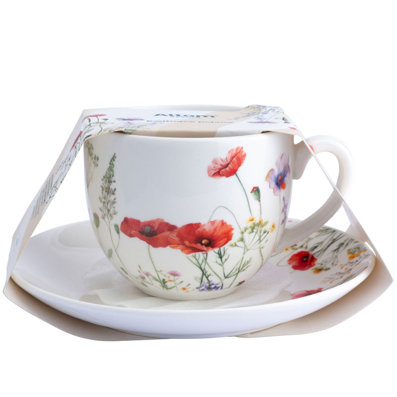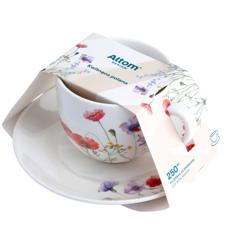 Чашата с чинийка "Цъфнали цветя" ALTOM с вместимост 250 мл е елегантен комплект, който съчетава функционалност и артистичен флорален дизайн. Изработена от висококачествен бял порцелан, тя е декорирана с деликатни полски цветя в акварелен стил, които придават свежест, лекота и естествено настроение на всяка трапеза. Комплектът включва чаша и съчетана чинийка, които оформят завършена и стилна визия.