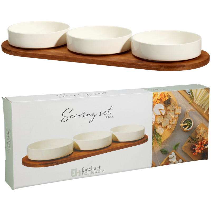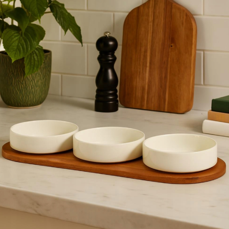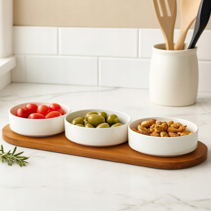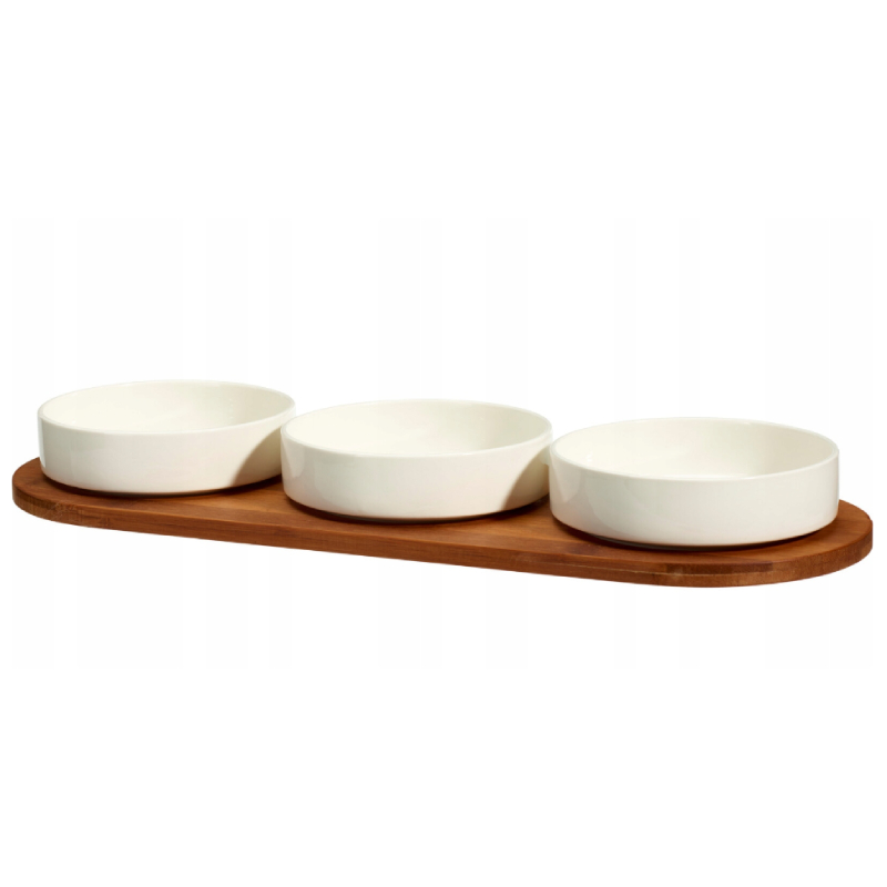 Тавата от тъмен бамбук придава топлина и стабилност, а купичките от висококачествен порцелан тип New Bone China са подходящи за сервиране на дипове, сосове, салати, ядки или плодове. Комплектът е идеален както за ежедневна употреба, така и за специални поводи, като добавя стил и удобство към всяка трапеза.