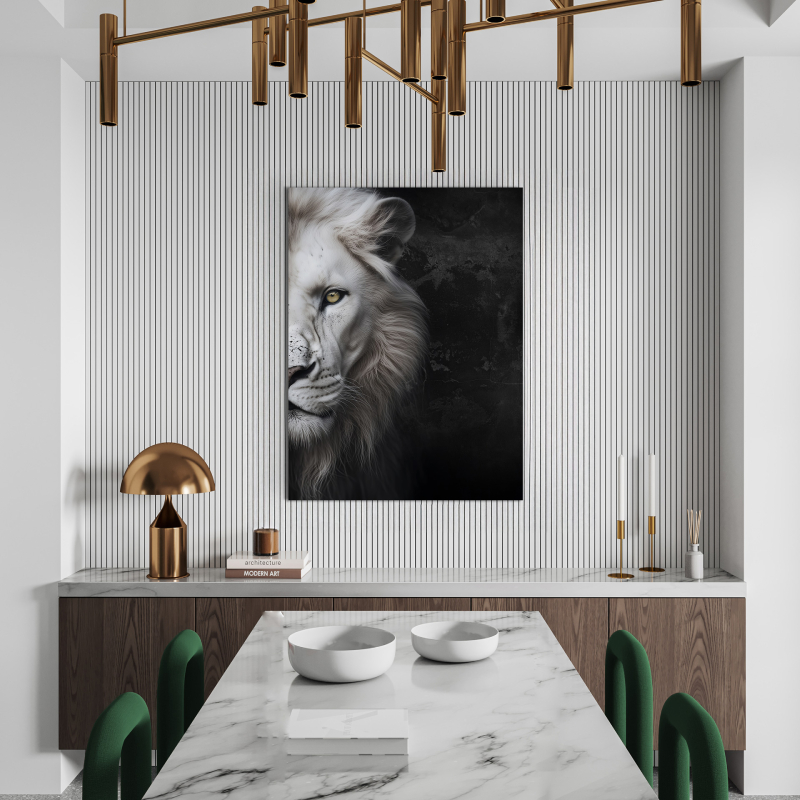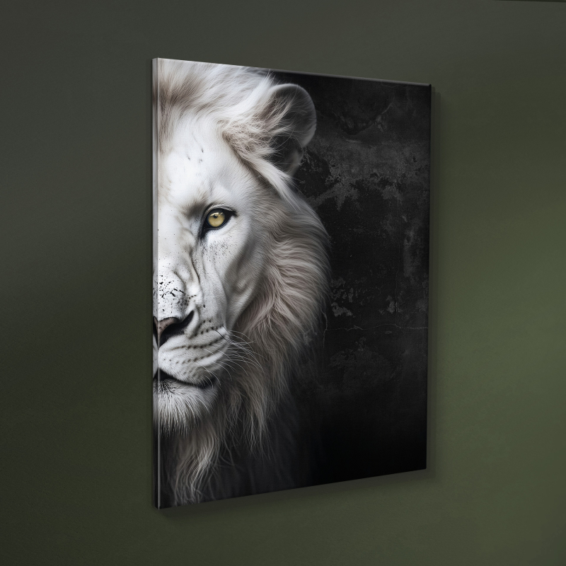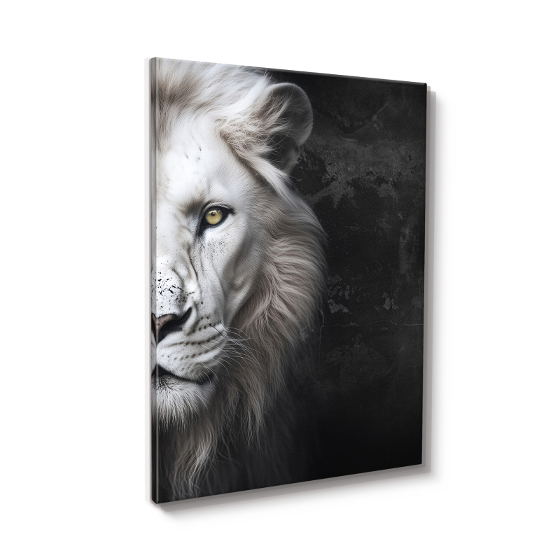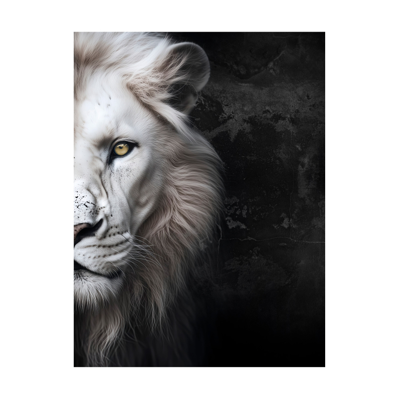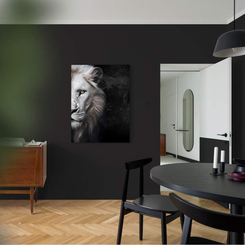 Картината за стена Lion е модерно декоративно пано, което впечатлява със силното си и елегантно излъчване. Изображението на глава на бял лъв символизира мощ, увереност и благородство, превръщайки картината в стилен акцент за всяко помещение. Контрастът между тъмните тонове и детайлното изображение придава дълбочина и артистичен характер на композицията.