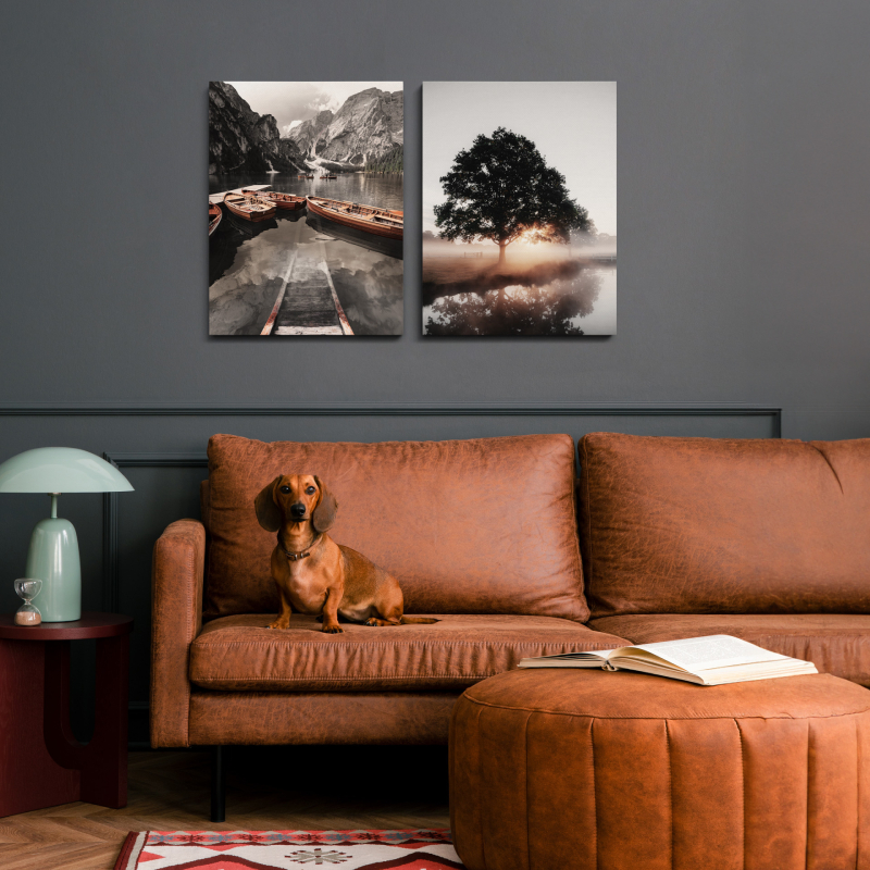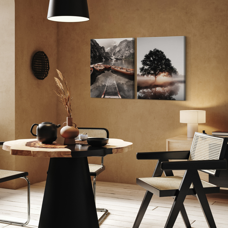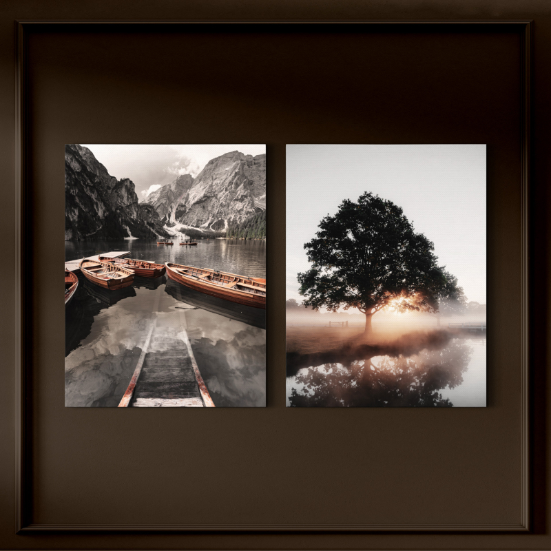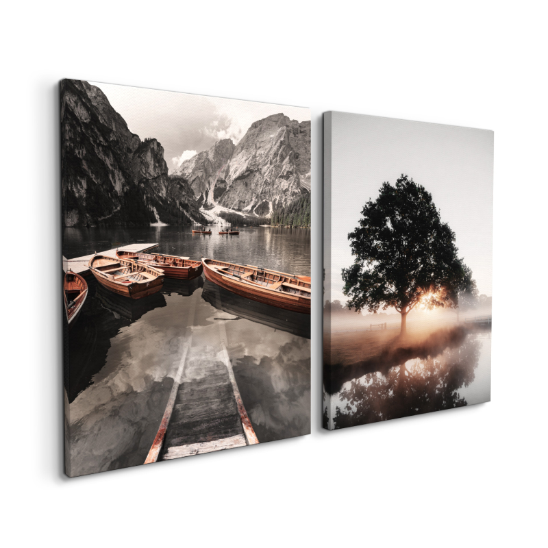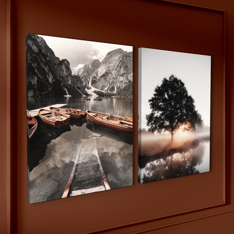 Комплектът картини ST757 "Гледка" включва две декоративни платна, които създават стилна и хармонична композиция върху стената. Пейзажният мотив придава усещане за спокойствие, пространство и естествена красота, което го прави подходящ избор за различни интериорни стилове.