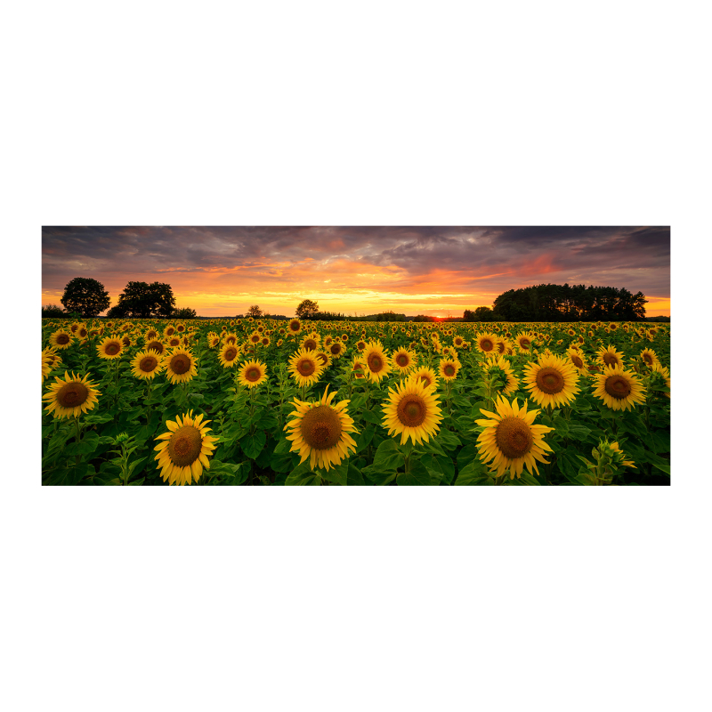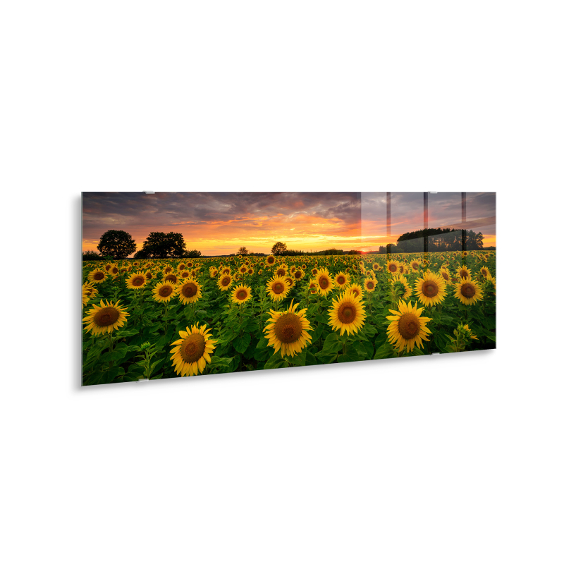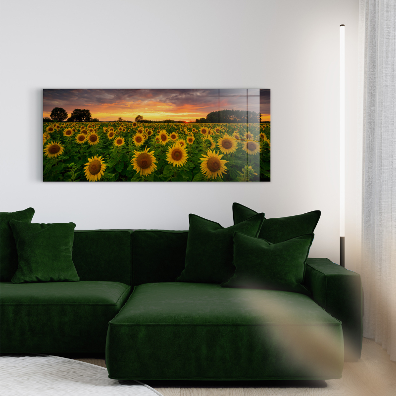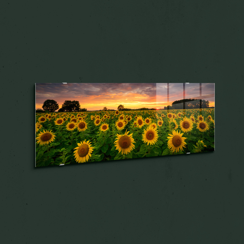 Картината GL545 "Слънчогледи" впечатлява с ярка и жизнерадостна композиция, представяща множество слънчогледи, огрени от топлите цветове на залеза. Съчетавайки златистите тонове на цветята с меката светлина на небето, изображението създава усещане за спокойствие, топлина и природна красота.