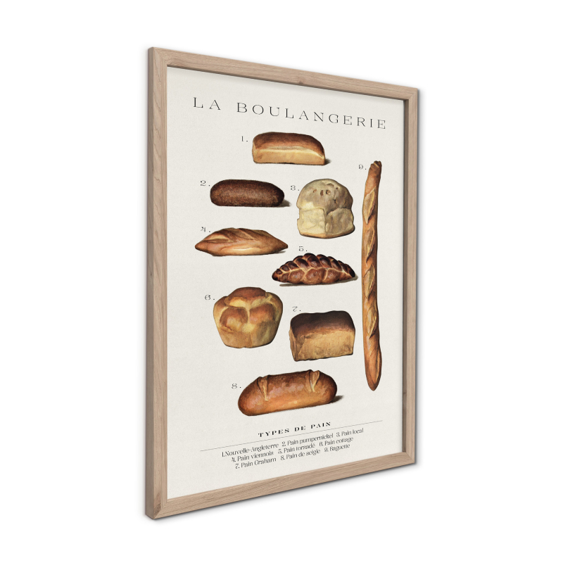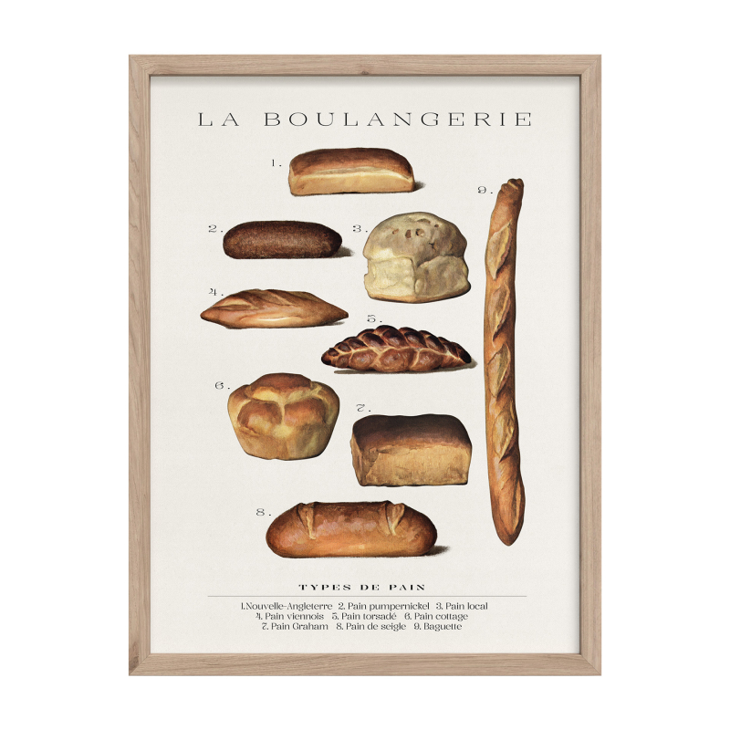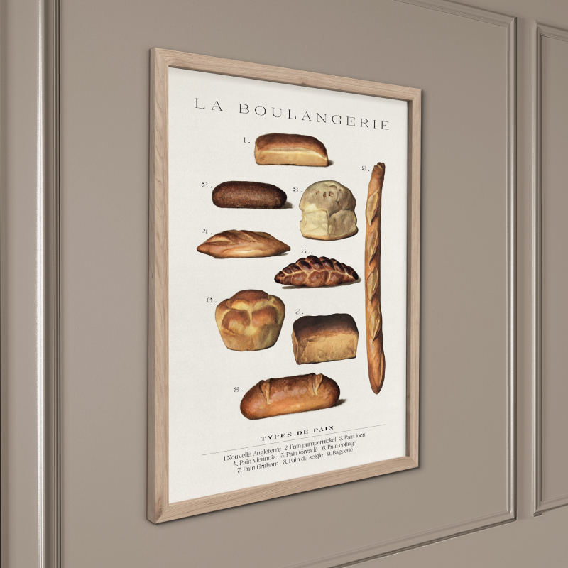 Картината "Багети" представя стилна композиция с различни видове багети, изобразени в класически илюстративен стил. Детайлните изображения напомнят на кулинарни или ботанически таблици и придават артистичен и оригинален характер на стенния декор.