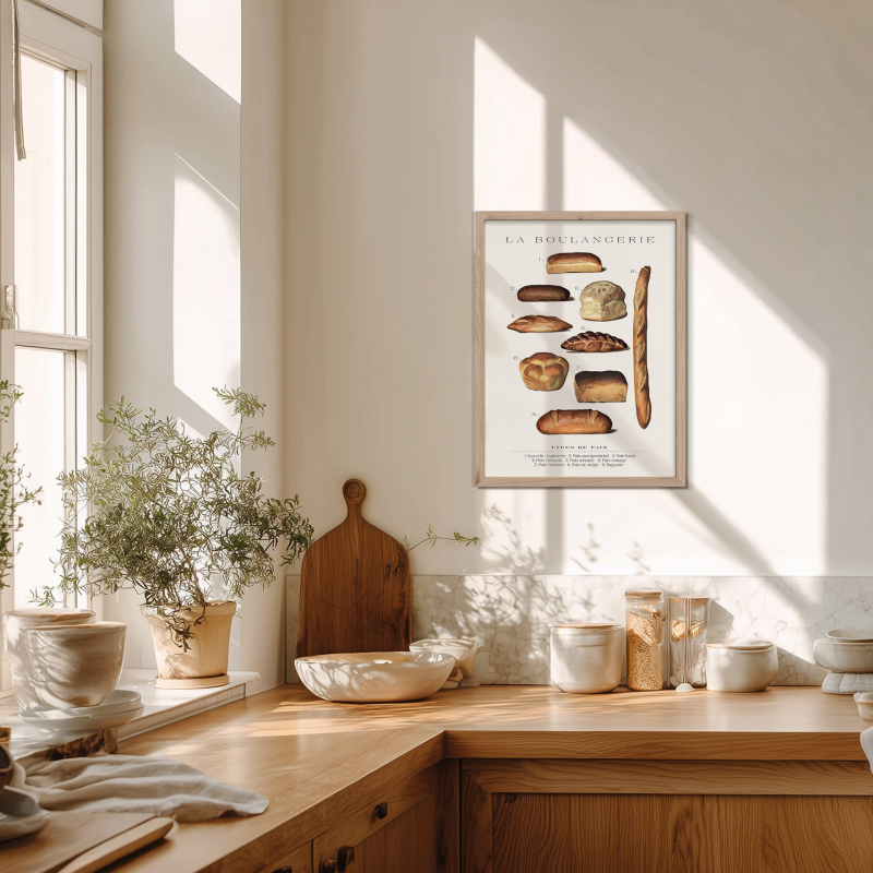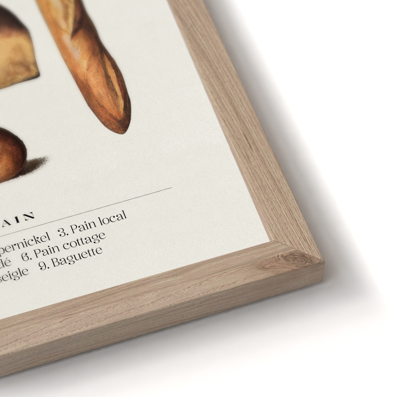 Топлите натурални тонове и изчистеният фон създават уютна атмосфера и правят картината подходяща за пространства, свързани с храната и кулинарията. Декоративната рамка в светъл дървесен цвят допълва визията и придава завършен вид на композицията.