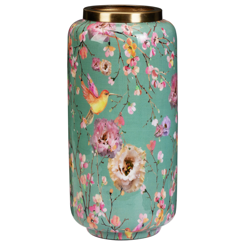 Елегантна метална ваза с красив флорален мотив, която придава свежест и стил на всяко пространство. Синият цвят в комбинация с декоративни цветя и фин златист кант създава изискан и привличащ вниманието дизайн, подходящ за различни интериорни решения.
