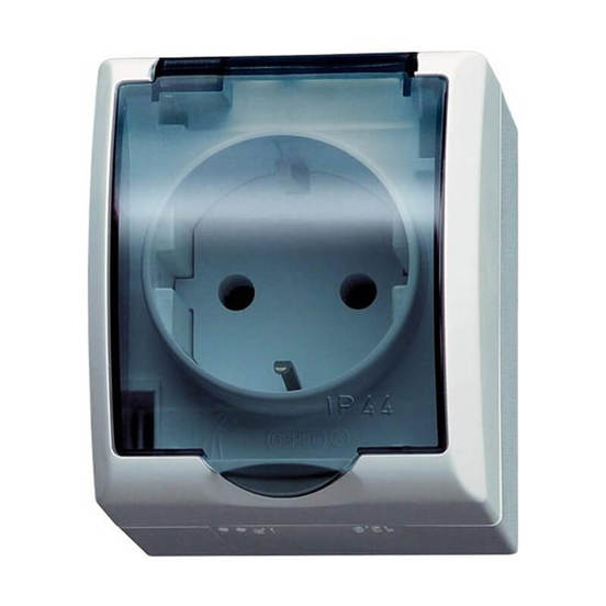 Единичен контакт "Шуко" OSPEL 16A с прозрачен капак от серията Fala за кабели до 2.5 мм2. Разполага със степен на защита IP44, което позволява използването му във влажни и запрашени среди.