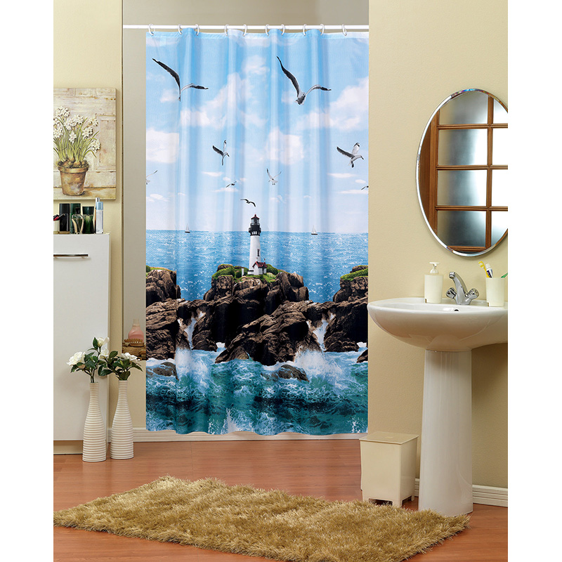 Завеса за баня от серията Tropik на марката BEYTUG. Завесата е с широчина 180см и височина 200см. Изработена е от 100% полиестер с плътност 90г/м2. Материята е с водоотблъскваща импрегнация. Завесата е с щампа на морски фар. Лесно се пере и глади, изсъхва бързо, отличава се с повишена устойчивост на износване.