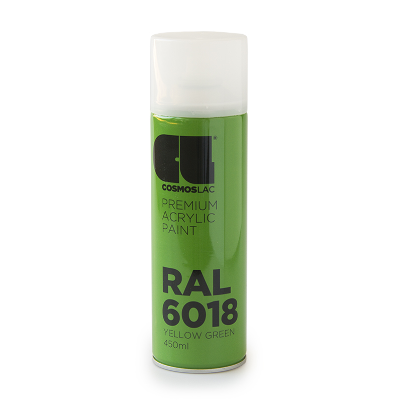 Жълто-зелена акрилна спрей боя RAL 6018, подходяща за боядисване на метални, дървени и керамични повърхности.