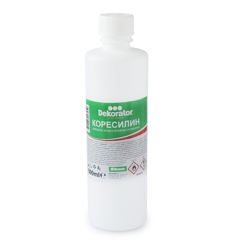 Разредител Коресилин на DEKORATOR. Продуктът се използва за разреждане на нитроцелулозни лакове, бои и грундове в органични разтворители. Използва се за обезмасляване на метални повърхности и за измиване на бояджийски инструменти /четки, валяци, шпакли, бояджийски пистолети, печатарски машини и др./.