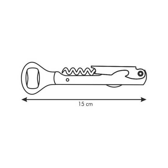 Келнерски тирбушон от серията Presto на марката TESCOMA. Приборът е с дължина 15см. Изработен е от висококачествена неръждаема стомана. Отличен за лесно отваряне на бутилки с коркови тапи. Кухненското пособие е снабдено с нож за лесно премахване на фолиото на винените бутилки. Има и отварачка за отваряне на бутилки с метални капачки.