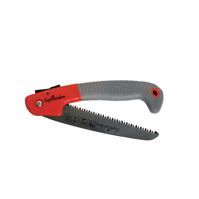 Сгъваем градинарски трион на марката TOP GARDEN. Инструментът е с дължина 18см. Снабден е със заключващ механизъм. Има тристранно заточени и закалени зъби, както и удобна двукомпонентна дръжка.