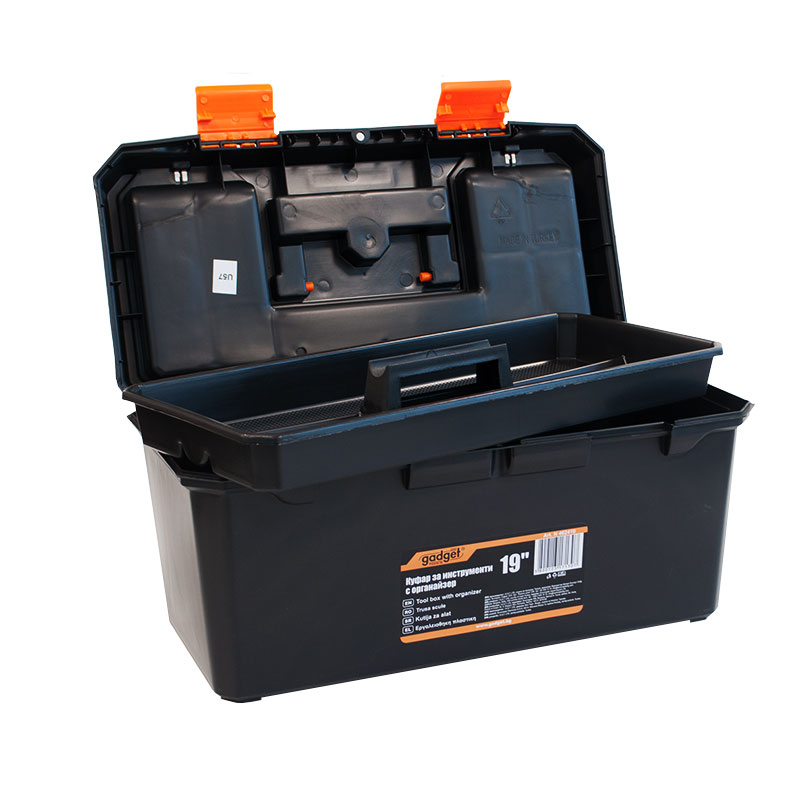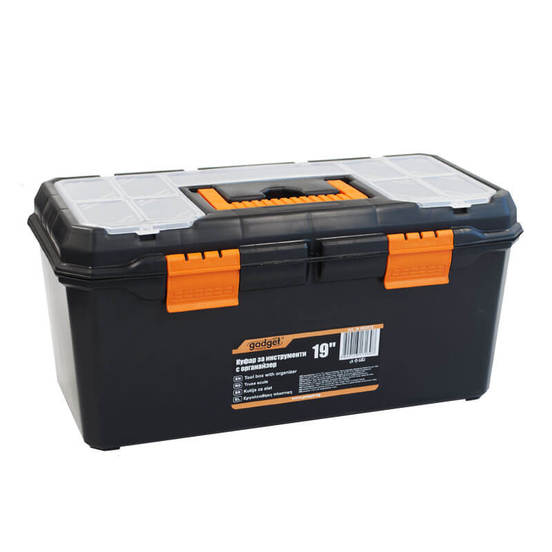 Куфар за съхранение и пренасяне на ръчни инструменти Gadget, с размер 19". Куфарът е изработен от висококачествена и издръжлива на високи натоварвания и удари пластмаса. Отличаващ се със сигурна и здрава пластмасова закопчалка. Куфарът за ръчни инструменти притежава удобна ергономична дръжка, за по-лесно пренасяне. Снабден е с удобни отделения с прозрачни капаци в горната си част, за прибиране на консумативи. Във вътрешната част на куфара за инструменти се намира удобният поднос - органайзер. Под него е предвидено достатъчно пространство за побиране на по-големи инструменти и консумативи. Куфарът за съхранение на ръчни инструменти Gadget 19" е с размери 470 x 220 x 230 mm.