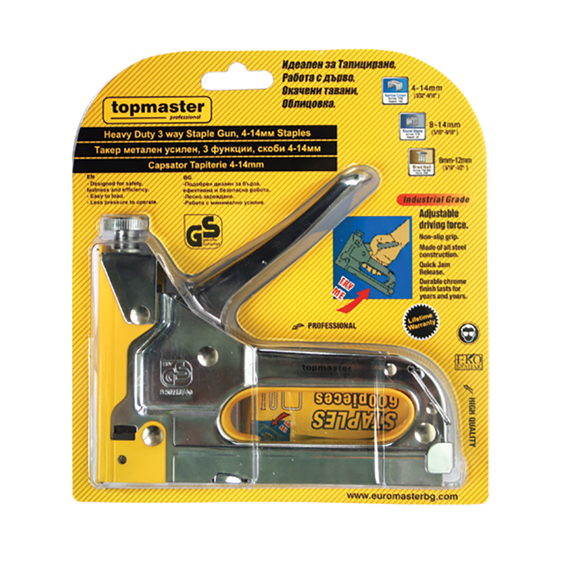 Усилен метален такер с дълбочина на пробиване 4 - 14 мм. Разполага с 3 функции. Идеален за тапициране, работа с дърво, окачени тавани, облицовка.