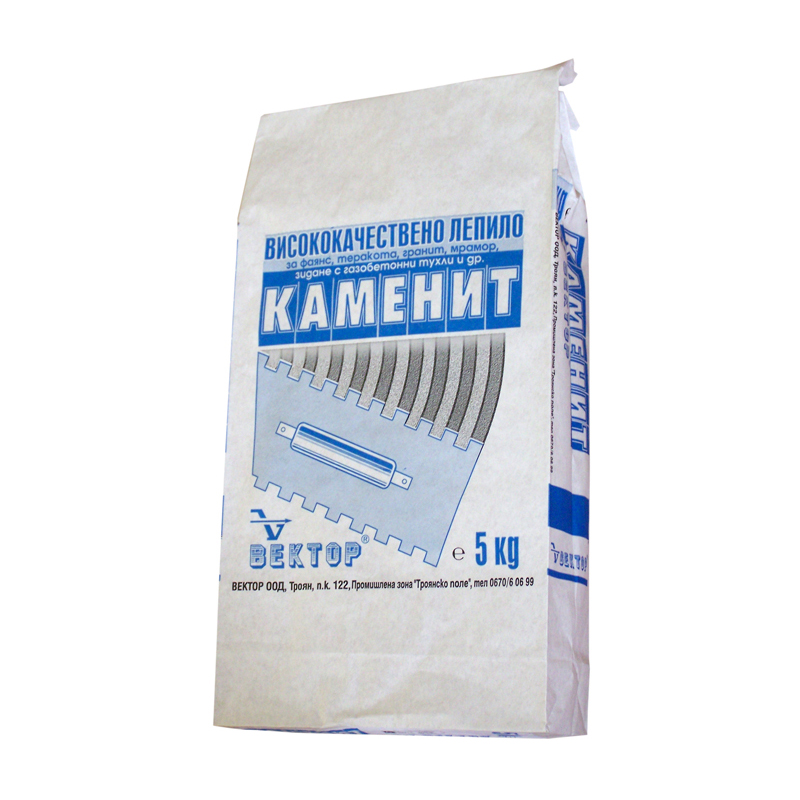 Сухо лепило ВЕКТОР за различни каменни облицовки. За лепене на керамични, фаянсови, мраморни и скални облицовки върху бетон, газобетон и цименто-пясъчни мазилки. Разфасовка: 1 кг.