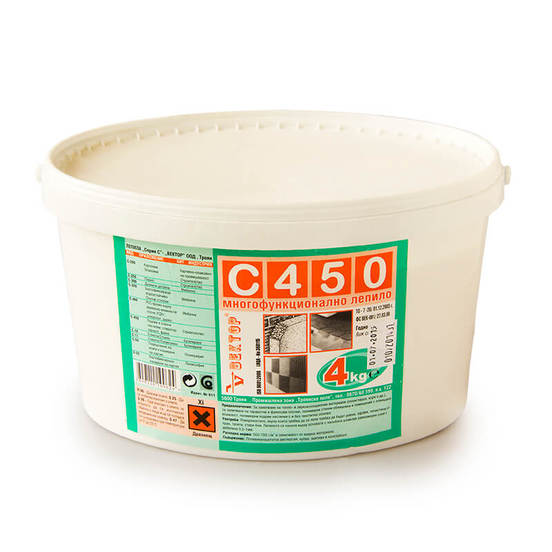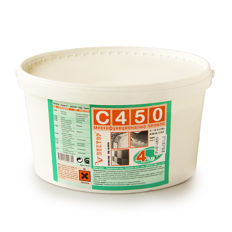 Лепило С 450 на марката ВЕКТОР. Предназначено за залепване на топло- и звукоизолационни материали (полистирол, корк), полимерни облицовки в помещения с висока влажност, подови настилки с и без текстилна основа, теракот и фаянс.