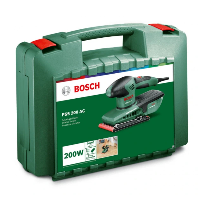 Виброшлайфът BOSCH PSS 200 AC е ергономичен инструмент, предназначен за прецизно шлифоване на дърво, метал и пластмасови повърхности. С мощност 200 W и честота на вибрациите до 24 000 об./мин, той осигурява бързо и ефективно премахване на неравности и обработка на големи повърхности. Правоъгълният шлифовъчен плот с размери 92 x 182 мм позволява едновременно висока производителност и прецизност, като специалната опъваща система улеснява смяната на шкурката за непрекъсната работа. Инструментът е предназначен за непрофесионална употреба и е подходящ за домашни работилници, ремонтни дейности и проекти "направи си сам".
