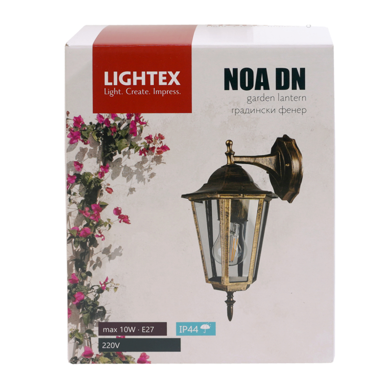 Осветително тяло LIGHTEX NOA с мощност max 10 W LED и цокъл 1 х E27. Градинският фенер най-често е подходящо осветление за закрити и открити помещения, тераси, стълбища, градински алеи и много други.