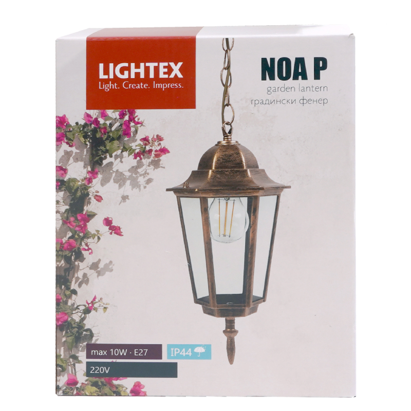 Осветително тяло LIGHTEX NOA с мощност max 10 W LED и цокъл 1 х E27. Градинският фенер най-често е подходящо осветление за закрити и открити помещения, тераси, стълбища, градински алеи и много други.