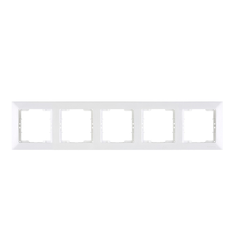 Декоративна петорна рамка-модул за ключове и контакти от серия CANDELA на MUTLUSAN. Декоративната рамка за ключове и контакти е изработена от пластмаса в цвят бял.
