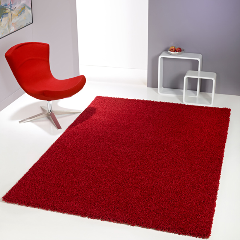 Модерен белгийски килим от серията Shaggy, модел Сенсейшън на DEVOS CABY в червен цвят. Красиво допълнение за всеки модерен интериор. Отличава се с висока устойчивост на износване и лесна поддръжка. Подходящ е за интериора на жилищни помещения, внасящи комфорт и уют във всеки дом. Моделът е машинно тъкан, изработен от 100% изключително омекотен полипропилен, с релефна структура. Качественият килим от серията Shaggy е с размер 140 х 200см, височина на косъма 30мм и общо тегло 2400 гр/кв.м.
