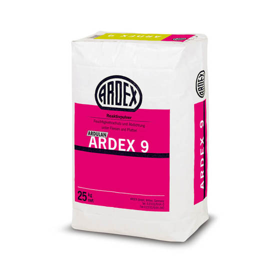 Двукомпонентна алтернативна хидроизолация ARDEX 9 за външна и вътрешна употреба за полагане под плочки и плоскости. Хидроизолацията е двукомпонентна и се състои от акрилатна дисперсия. Отговаря на указанията за изпълнение на уплътнения при облицовки и настилки от плочки и плоскости. ARDEX 9 покрива изискванията за устойчивост на влага от 1ва, 2ра и 3та група.