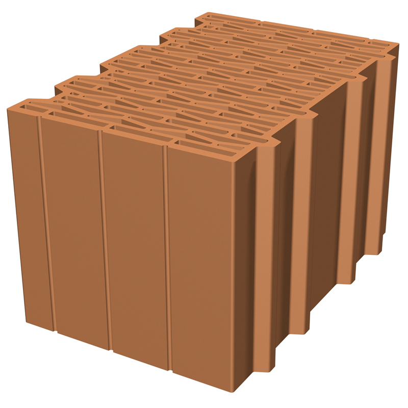Тухла с кухини WIENERBERGER Porotherm 38 N+F Hi с повишени топлоизолационни характеристики. С тези блокове се изпълняват еднослойни стени без необходимост от допълнителна топлоизолация, отговарящи на изискванията на наредба № 7 за топлосъхранение, с нут и федер, предназначени за защитена зидария при неносещи зидове с дебелина на зида 38 см.