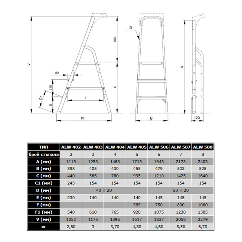 Допълнителна сигурност и стабилност дават ремъците, които са захванати към стълбата чрез стоманени нитове. В разпънато състояние, стълбата е с височина 1837мм. Максималната височина на работа - 3210мм.