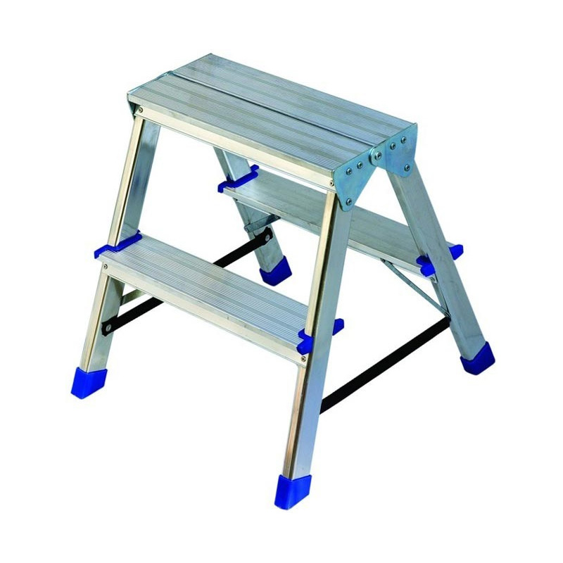 Алуминиева двураменна стълба с 2 х 2 стъпала на марката ELKOP, издържаща на максимално натоварване до 150кг. Максималната работна височина на двураменната стълба е 43см.