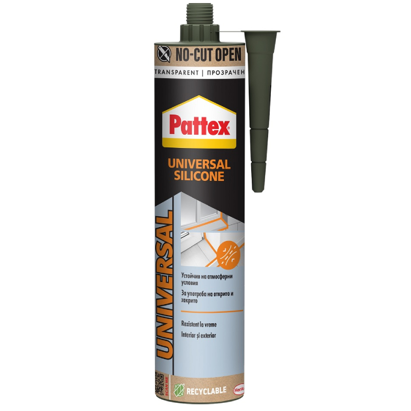 Универсалният силикон е подходящ за използване върху стъкло, керамика, глазирани повърхности и алуминий. Устойчив е на почистващи продукти, UV-лъчи, дъжд, скреж и др.