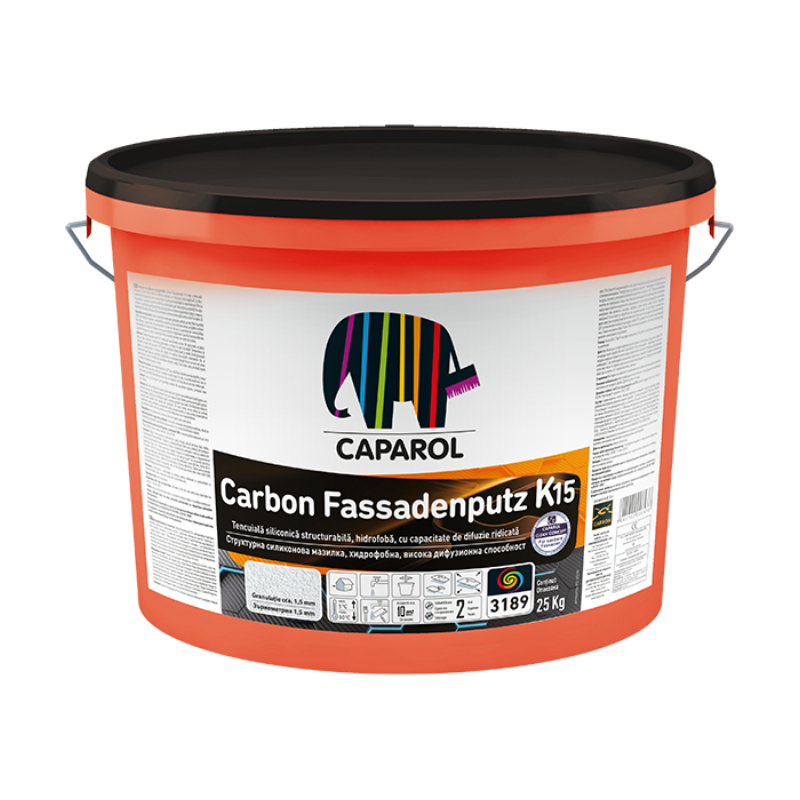 Карбонова мазилка Fassadenputz К15 на марката CAPAROL. Със зърнеста структура с едрина 1.5 мм. Цвят: бял.