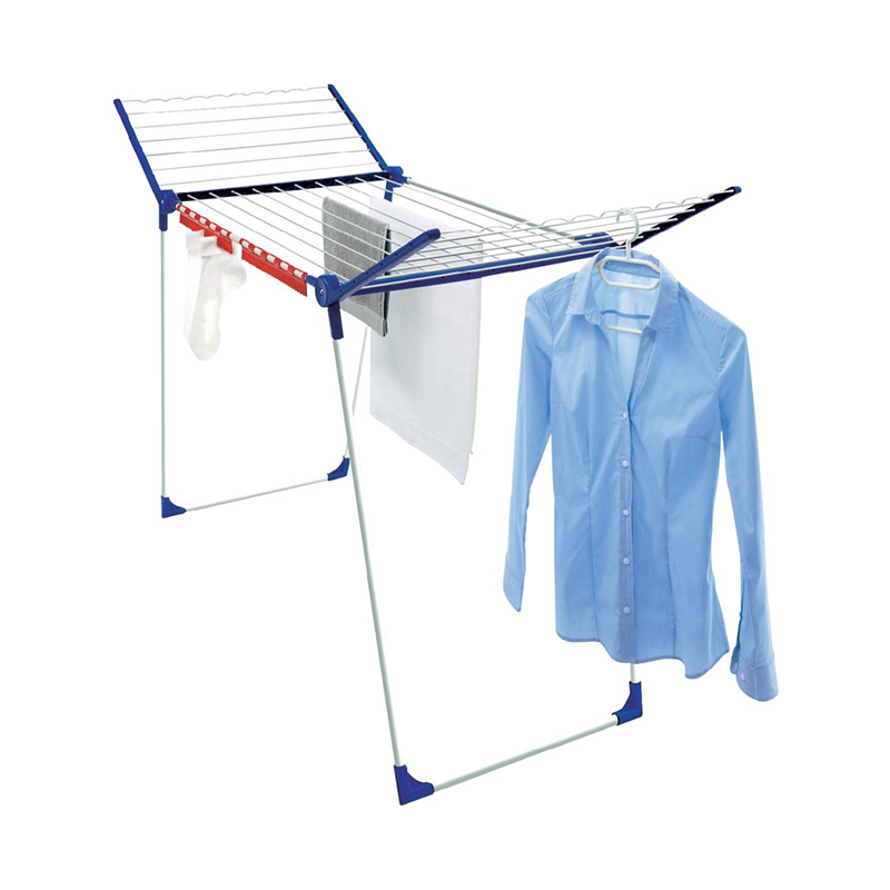 Clothes dryer LEIFHEIT Pegasus 200 with dimensions when folded 95 x 67 x 5 cm, made of metal and plastic. It has a total length of 20 m, corrugated bars at the ends for attaching clothes hangers.