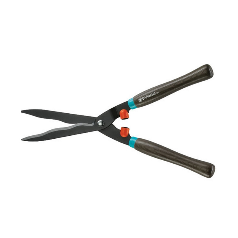 Shrub shears from the Classic series of the GARDENA brand. Scissors are especially suitable for proper hedge maintenance. The working part of the cutting tool is made of high quality steel. The blades are wavy and serrated for greater work efficiency. They have a non-stick coating. The ergonomically designed handles are made of PVC with imitation wood. The model has a built-in cutter for thicker branches.The cutting tool is essential for aesthetes who keep their garden looking beautiful and durable.The total length of the scissors for bushes is 54 cm, and only the blades are 23 cm long.