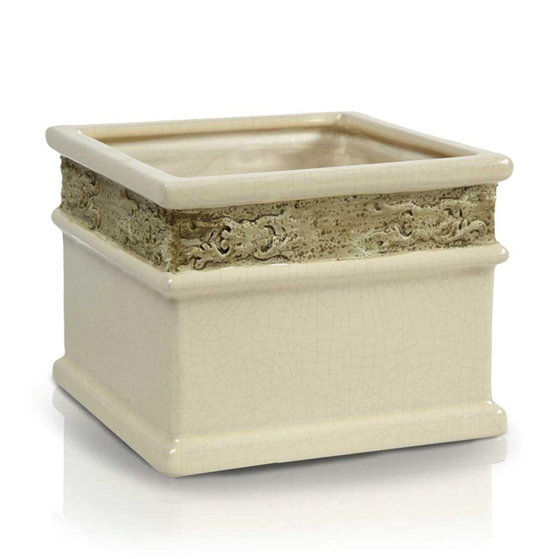 Square pot from the Relief series of the POLNIX brand. The pot measures 12 x 12 cm and is 10 cm high. It is made of high quality glazed ceramics in cream color. The surface of the pot mimics cracking. It is ideal for complementing the interior of rooms decorated in a classic style.