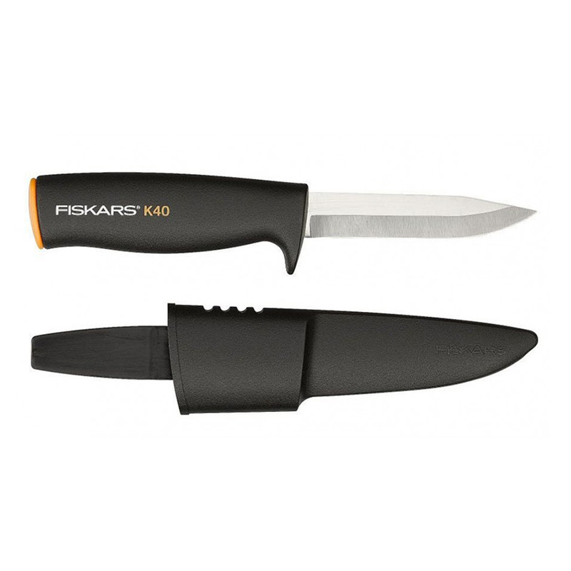 Universal knife of the FISKARS brand. The cutting tool is 21.8 cm long. A belt sheath is included with the knife set. The sheath is made of high quality and durable plastic.The universal knife has a comfortable ergonomic handle, which is also made of plastic. There is a finger guard.The blade itself is 10 cm long and is made of stainless steel.