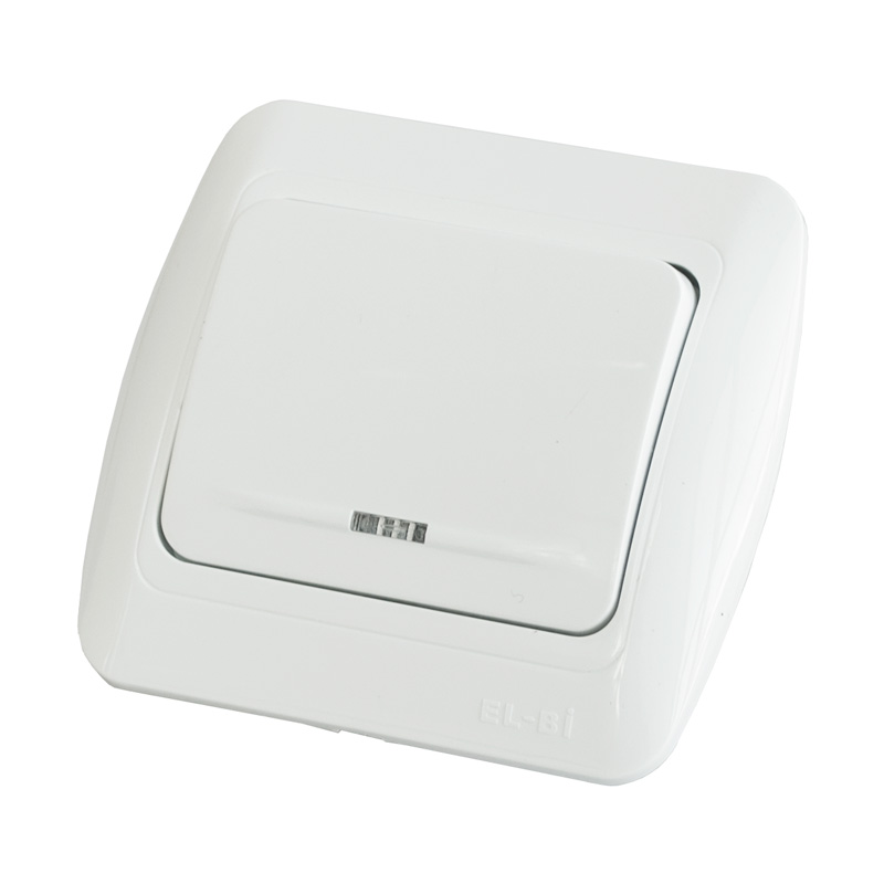 The single electric switch EL-BI cx1 SI from the TUNA series is designed for concealed installation in a single console.The method of installation is done with screws. Rated current 10A, voltage 230 V and maximum power 2300 W. Its operating frequency is 50 Hz, has a degree of protection IP20. The operating mode is restraining.The electric switch has a light indication and is made of white plastic.